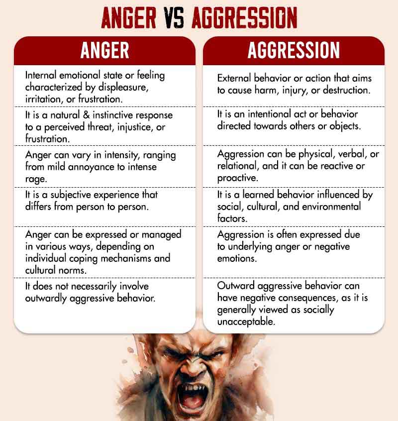 - Expression, or the outward manifestation of anger through verbal outbursts, aggression, or non-verbal cues