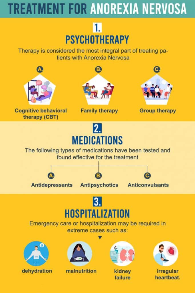 The main form of treatment is a combination of therapy and medications. A 2001 study [mfn] Löwe B, Zipfel S, Buchholz C, Dupont Y, Reas DL, Herzog W. Long-term outcome of anorexia nervosa in a prospective 21-year follow-up study. Psychol Med. 2001 Jul;31(5):881-90. doi: 10.1017/s003329170100407x. PMID: 11459385. [/mfn] demonstrated a full recovery even after 21 years of chronic severe anorexia nervosa. There are several treatment methods for Anorexia nervosa that are adopted to help ease the symptoms of the condition. They include: