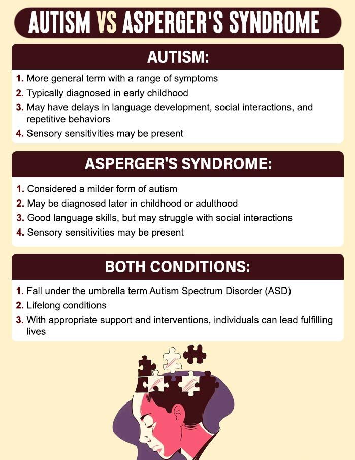 Asperger’s syndrome is typically considered a milder form of ASD, and individuals with Asperger’s often have average to above-average intelligence and language skills. They may also have no such delays in language development than those with other forms of autism.