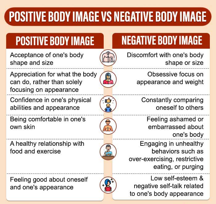Body image can be positive or negative. Positive body image refers to [mfn] Tort-Nasarre, G., Pollina-Pocallet, M., Ferrer Suquet, Y., Ortega Bravo, M., Vilafranca Cartagena, M., & Artigues-Barberà, E. (2023). Positive body image: a qualitative study on the successful experiences of adolescents, teachers and parents. International journal of qualitative studies on health and well-being, 18(1), 2170007. https://doi.org/10.1080/17482631.2023.2170007 [/mfn] having a healthy and realistic perception of one’s body. It involves feeling comfortable and confident in one’s own skin, regardless of societal norms or pressures.