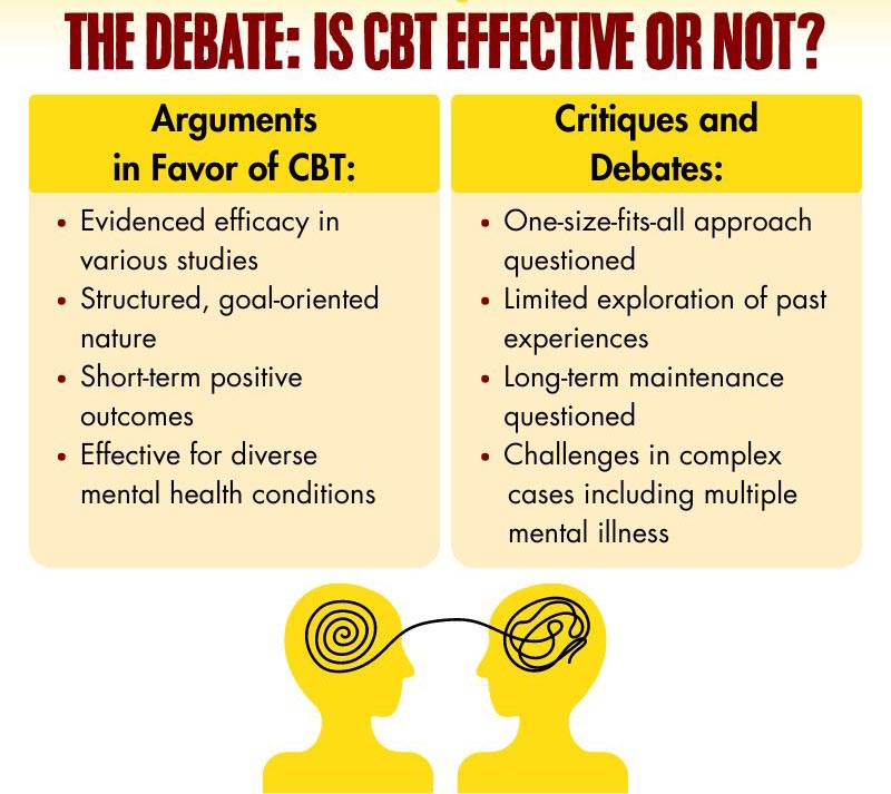 - While CBT’s efficacy is supported by substantial research, ongoing debates exist around its one-size-fits-all approach, short-term focus, and long-term durability of therapeutic gains.