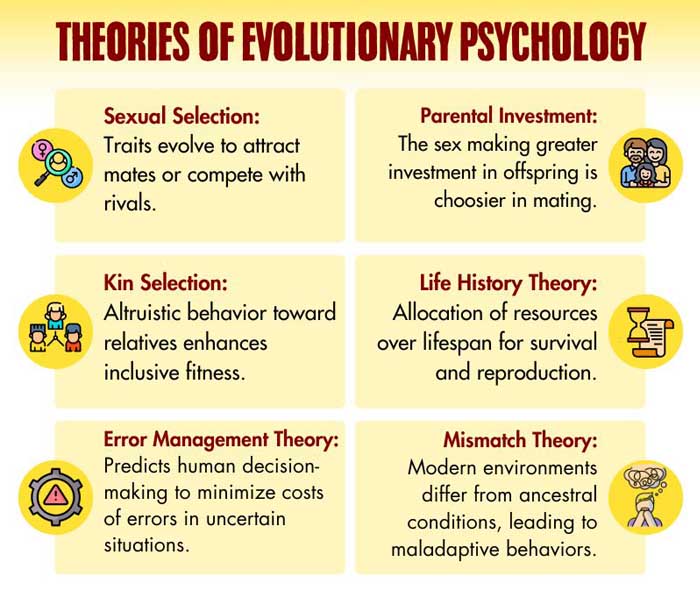 - Evolutionary psychology examples include mate selection, fears (like heights), and food preferences.