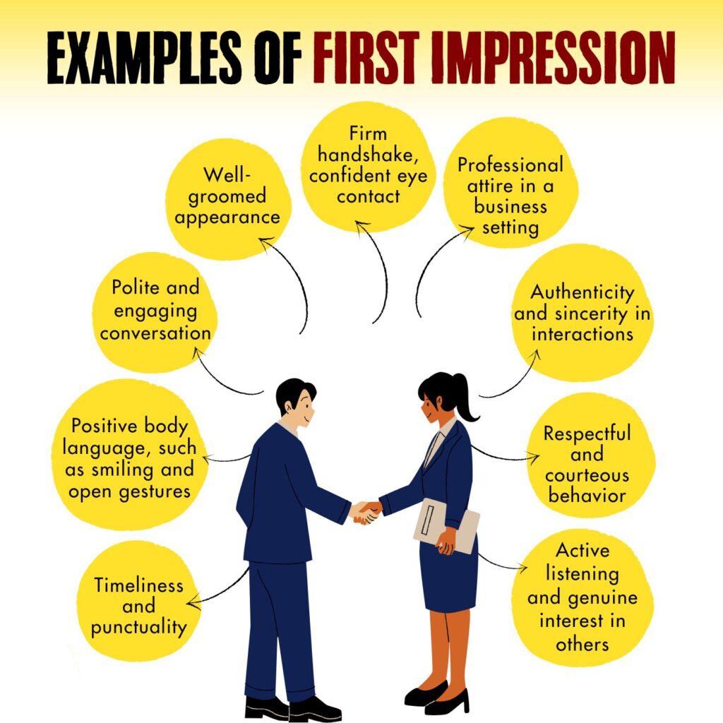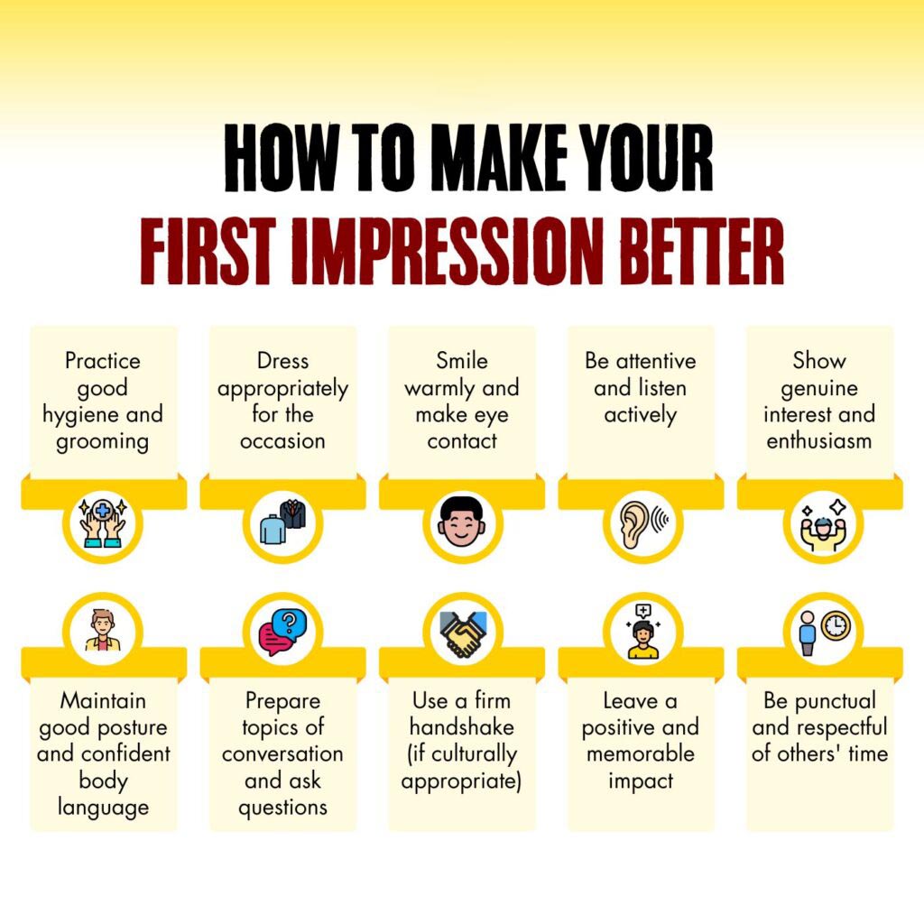 - Strategies on how to make a good first impression involve dressing appropriately, maintaining good posture, active listening, etc.