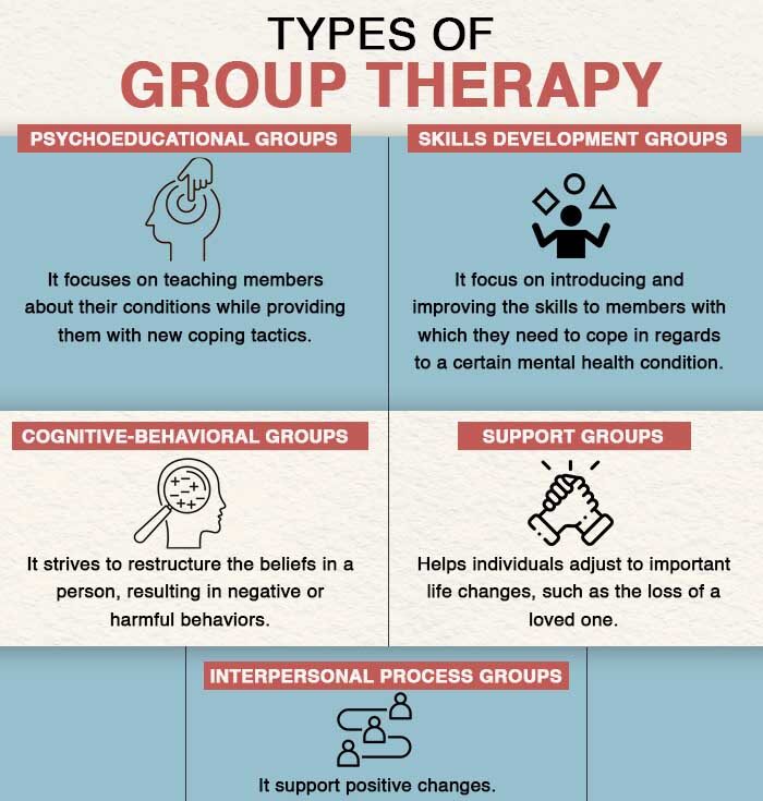 Psychoeducational group therapy [mfn] Center for Substance Abuse Treatment. Substance Abuse Treatment: Group Therapy. Rockville (MD): Substance Abuse and Mental Health Services Administration (US); 2005. (Treatment Improvement Protocol (TIP) Series, No. 41.) 2 Types of Groups Commonly Used in Substance Abuse Treatment. Available from: https://www.ncbi.nlm.nih.gov/books/NBK64214/ [/mfn] focuses on teaching members about their conditions while providing them with new coping tactics. These groups deal with a specific condition, such as substance use disorder, anxiety, or phobias.