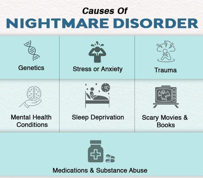 The exact cause of nightmare disorder is yet to be known. However, repeated nightmares often tend to have an underlying cause. Studies [mfn] Levin R, Nielsen TA. Disturbed dreaming, posttraumatic stress disorder, and affect distress: a review and neurocognitive model. Psychol Bull. 2007 May;133(3):482-528. doi: 10.1037/0033-2909.133.3.482. PMID: 17469988. [/mfn] reveal that “No models adequately explain nightmares nor have they been reconciled with recent developments in cognitive neuroscience, fear acquisition, and emotional memory.”