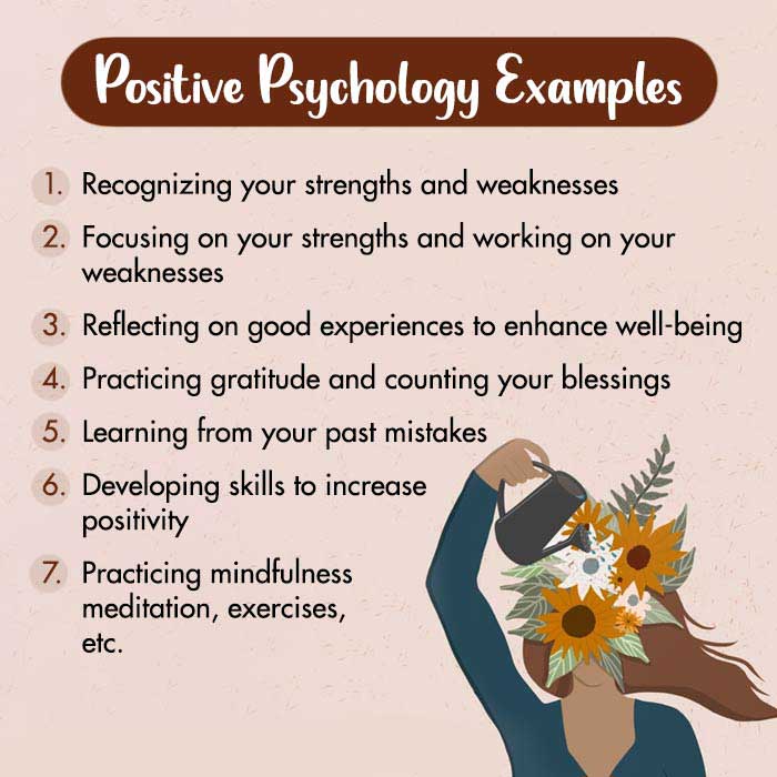 - Common positive psychology examples include journaling, practicing gratitude, availing mindfulness exercises, etc.
