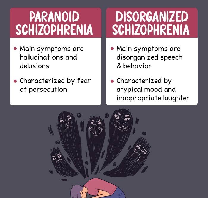 The common types [mfn] Wy , T., & Saadabadi, A. (2022). Schizoaffective Disorder. In StatPearls. StatPearls Publishing. Available from: https://www.ncbi.nlm.nih.gov/books/NBK541012/ [/mfn] of schizophrenia include: