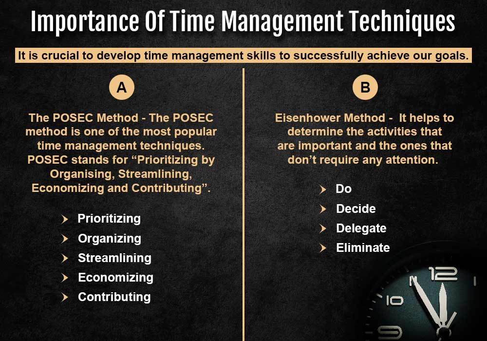 A 2009 study [mfn] Jackson VP. Time management: a realistic approach. J Am Coll Radiol. 2009 Jun;6(6):434-6. doi: 10.1016/j.jacr.2008.11.018. PMID: 19467489. [/mfn] pointed out that realistic time management and organizational plans can improve productivity and quality of life. Another 2019 study [mfn] Adams, R. V., & Blair, E. (2019). Impact of time management behaviors on undergraduate engineering students’ performance. SAGE Open, 9(1), 215824401882450. https://doi.org/10.1177/2158244018824506 [/mfn] found that effective time management is associated with greater academic performance and lower levels of anxiety in students. It is crucial to develop time management skills to successfully achieve our goals. In order to do this, there are several time management techniques that can be used. Some of these are as follows: