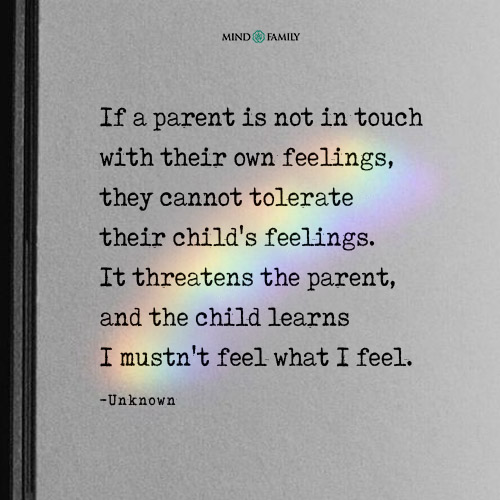 If a parent is not in touch with their own feelings, they cannot tolerate their child’s feelings. It threatens the parent, and the child learns I mustn’t feel what I feel.